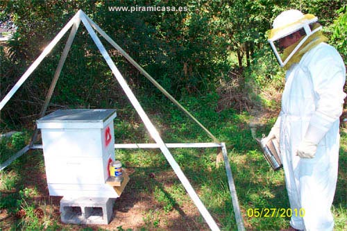 Другая форма лечения - антипирамида, которая также приносит огромную пользу, при использовании нескольких пирамид или даже одной, в зависимости от количества ульев, подлежащих лечению. В настоящее время дезинфекция ульев длится около 45 минут с интервалом в два-три часа, добавляя один или два 20-минутных сеанса в ночное время, чтобы очистить не только ульи, но и тела самих пчел.