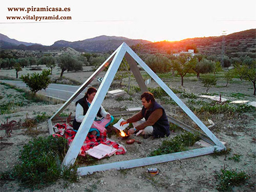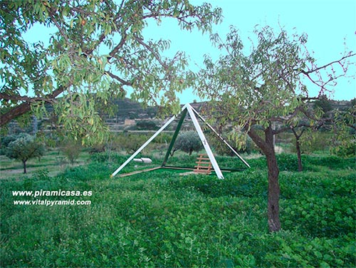 Эта пирамида использовалась для практики Агни Хотра (или Агнихотры), которая дает превосходные результаты во многих странах. Для тех, кто знаком с этой техникой биоэнергетической стимуляции полей, мы используем почти ту же самую, что и для томатов, хотя и на базе 2,5 метра. На этой пустоши, где миндальные деревья едва плодоносили, после практики Агни Хотра и без какого-либо улучшения климатических условий миндальные деревья дали урожай, невиданный ранее, в радиусе пятисот метров. Наша научная группа не может объяснить, почему Агни Хотра оказалась столь успешной, но эксперимент дал неоспоримые результаты. Два года спустя операция была повторена с тем же результатом, несмотря на засуху, поразившую регион в те годы.